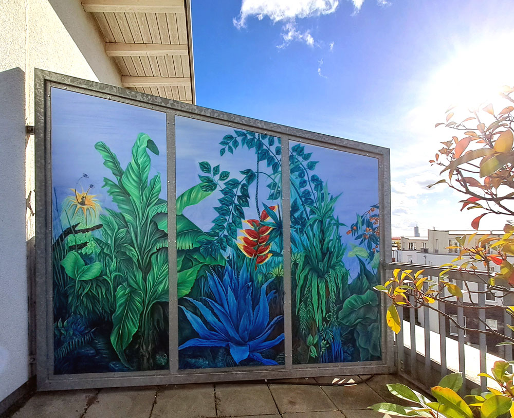 Nr. 2084-2086 | Paradies in Köln Nippes Original: Acryl auf Leinwand | Triptychon 190 x 76 cm – 180 x 120 cm – 170 x 76 cm | 2025 Für Terrassenkunst: Druck auf wetterfester Folie auf Alu Dibond | Triptychon 190 x 76 cm – 180 x 80 cm – 170 x 76 cm | 2025 |